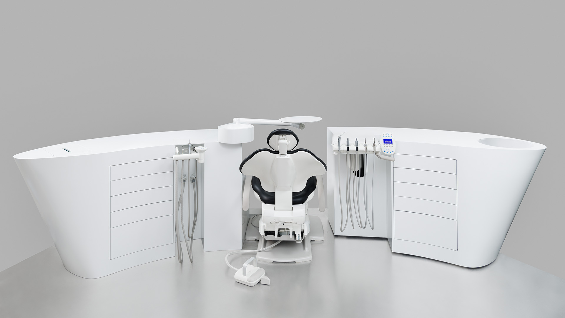 Modul 975 combine ergonometry, hygiene, and a futuristic desing. Due to their semi-circular shape, the cabinets are always ergonomically arranged around the workplace centre so that all the instruments are within reach, exactly where one would intuitively look for them. The module’s thoughtful functionality makes your work more comfortable and less tiring and allows you to easily maintain high level of hygienic standards.
