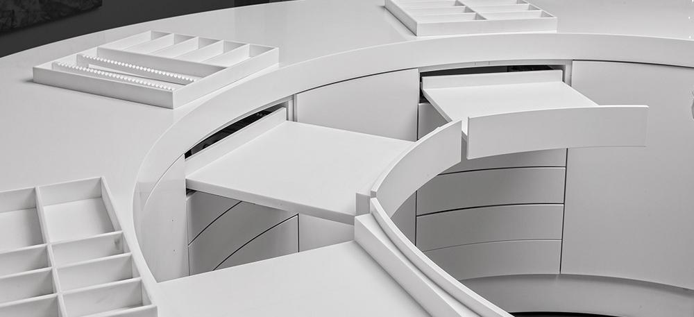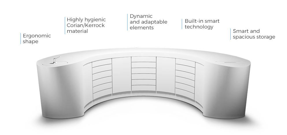 Modul 975 combine ergonometry, hygiene, and a futuristic desing. Due to their semi-circular shape, the cabinets are always ergonomically arranged around the workplace centre so that all the instruments are within reach, exactly where one would intuitively look for them. The module’s thoughtful functionality makes your work more comfortable and less tiring and allows you to easily maintain high level of hygienic standards.
